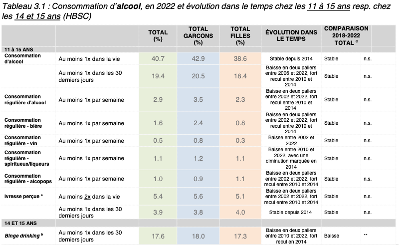 La consommation d'alcool tend à rester stable voire à baisser, ce qui n'est pas le cas de l'ivresse selon les groupes d'âge. L’ivresse perçue au moins une fois dans les 30 derniers jours (dans le questionnaire ) « avoir bu de l’alcool au point de se sentir vraiment soûl·e ») concerne environ 4% des 11 à 15 ans, avec une nette augmentation entre les 11 ans et les 15 ans. Quant au binge drinking au moins une fois dans les 30 derniers jours (dans le questionnaire : « au moins cinq boissons alcooliques lors d’une même occasion, c’est-à-dire dans un court laps de temps) ; question posée aux 14 et 15 ans uniquement), il est stable depuis 2014 chez les 15 ans, mais à niveau élevé (environ 23% des 15 ans).