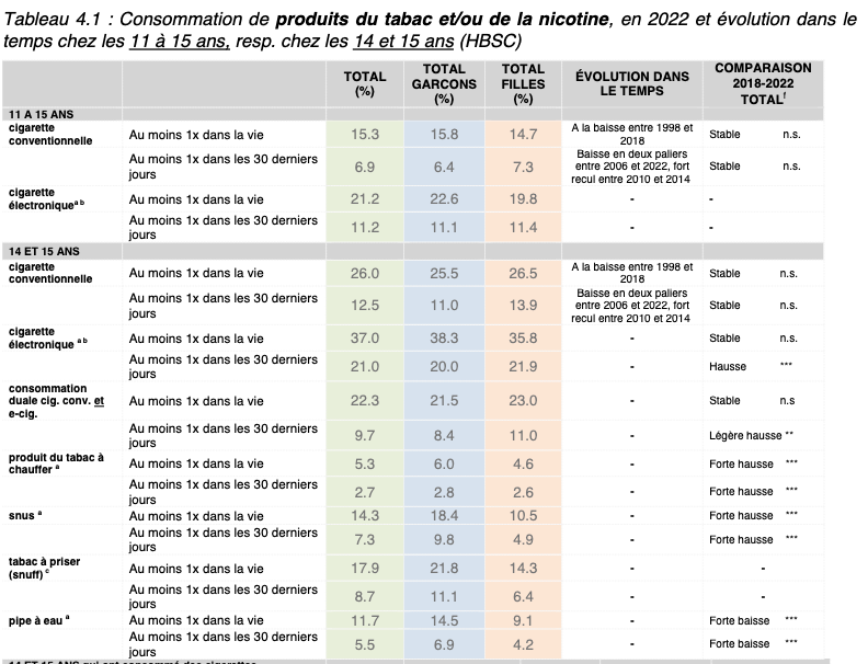 L'étude Health Behaviour in School-aged Children (HBSC) montre que les jeunes adolescent·e·s n’ayant consommé aucune substance psychoactive sont minoritaires vers l’âge de 14 et 15. Elle montre, pour cette catégorie, de fortes hausses pour la consommation de produits du tabac et/ou de la nicotine. En 2022, «un jeune de 15 ans sur trois a consommé au moins un produit tabagique ou nicotinique au cours des 30 jours ayant précédé l’enquête». Addiction Suisse, auteur du rapport en Suisse, note une augmentation de l’utilisation de la vaporette qui inclut - sans distinction - les puffs bars sous leurs différentes formes. 25% des 15 ans les ont utilisés au moins une fois au cours de leur existence. Les évolutions à la hausse chez les 13 ans pour l’alcool et pour la cigarette conventionnelle sont préoccupantes, selon l'étude.