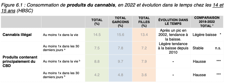 La prévalence à vie de la consommation de cannabis illégal chez les 14 et 15 ans a poursuivi son recul en 2022, venant ainsi confirmer la tendance claire à la baisse qui s’était amorcée après le pic enregistré en 2002.