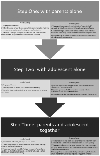 Plus tard dans le processus, le jeu est introduit dans les séances familiales, offrant des occasions utiles d'intervenir sur les perspectives des membres de la famille et les modèles d'interaction révélés in vivo lorsque le jeune joue au jeu. Ces séances peuvent déclencher des émotions et des réactions fortes de la part des parents et du jeune et donner lieu, sous la houlette du thérapeute, à des adaptations de transactions entre eux. L'expérience permet de vivre de façon encadrée de nouvelles discussions et de nouveaux paramètrages dans la relation.