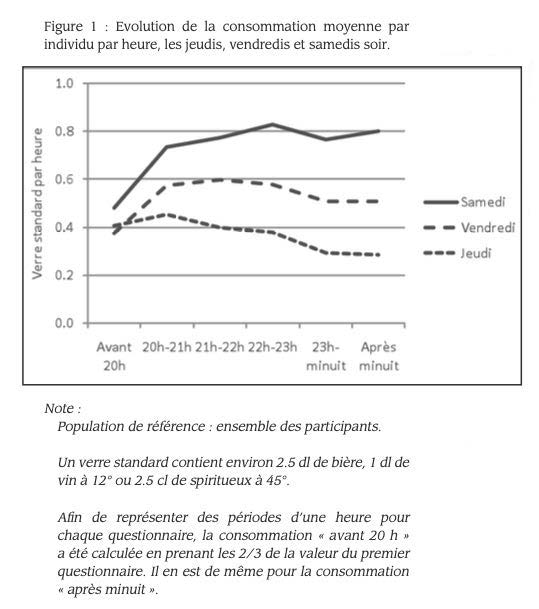 Dans le présent article, après avoir décrit les habitudes de consommation d’alcool des participants, nous examinerons l’évolution de leur consommation, heure par heure, les jeudis, vendredis et samedis soir. Nous étudierons ensuite l’influence des « apéros » avant de sortir sur le nombre de boissons consommées sur l’ensemble de la soirée et le risque de conséquences négatives, et nous investiguerons si des caractéristiques propres à l’individu, telles que les habitudes ou les motifs de consommation, sont liées à la pratique des apéros. Finalement, les résultats seront mis en perspective dans une optique de santé publique afin de proposer des mesures et pistes de réflexion permettant de réduire les risques liés à la consommation excessive d’alcool lors des soirées de fin de semaine.