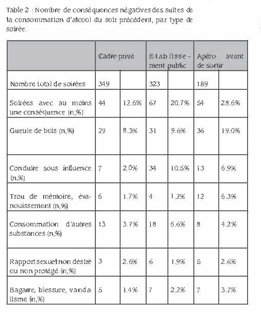 En outre, le dernier questionnaire demandait si les conséquences suivantes avaient eu lieu des suites de la consom-mation d’alcool du soir d’avant : gueule de bois – conduite d’un véhicule après avoir bu trois boissons alcoolisées ou plus – implication dans une bagarre ou une dispute – blessure à soi-même ou à quelqu’un d’autre – perte de souvenir des événements (même sur courte période) – consommation d’autres substances qui n’était pas prévue en début de soirée – rapport sexuel sans protection ou non désiré – dommage à la propriété et au matériel, vandalisme.