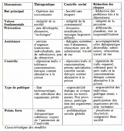 C’est à la suite de ce postulat que l’ex-sous-commission Drogue de la Commission fédérale des stupéfiants s’est mise au travail. Une exploration préalable, conduite par le professeur Sandro Cattacin et son équipe à Francfort, Modène, Göteborg, Lyon, Rotterdam et en Valais, a, dans un premier temps, permis de déterminer 3 principaux « modèles »: un modèle thérapeutique; un modèle de contrôle social; un modèle de réduction des risques.