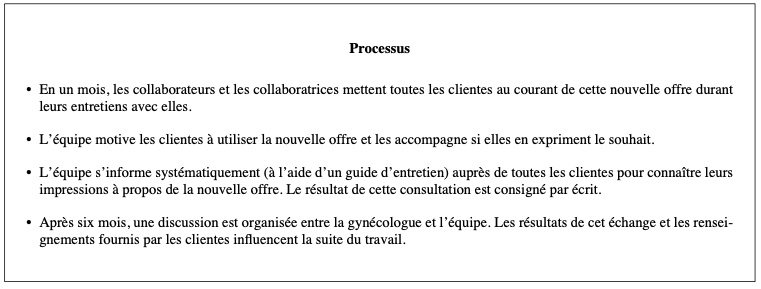 L’étape suivante consiste à mettre en relation les éléments structurels, les processus et les résultats avec les prestations pour obtenir un instrument de qualité. On montre cela par l’exemple de la prestation présence régulière d’une gynécologue :