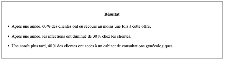 Prenons l’objectif 1: Amener les femmes à reprendre conscience de leur capital-santé. Les prestations correspondant à la réalisation de cet objectif sont les suivantes: