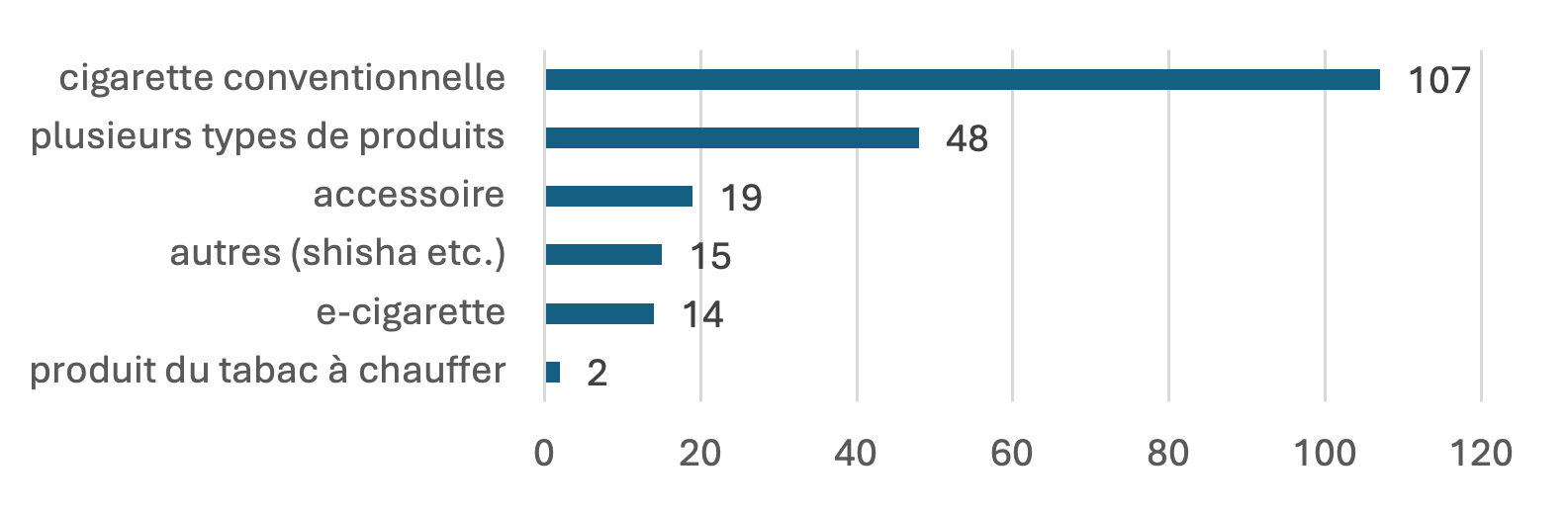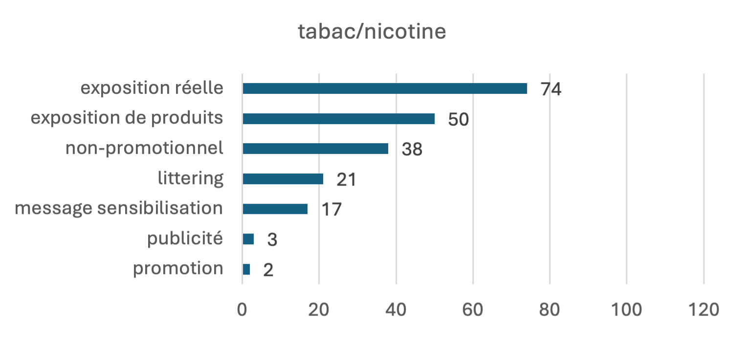Concernant les produits du tabac/de la nicotine, une majorité des stimuli est associée soit à la cigarette conventionnelle, soit à différents produits à la fois, et l’éventail des produits impliqués est large. Un tiers environ des stimuli est lié à une exposition réelle, c’est-à-dire à l’observation de personnes qui fument ou vapotent. Un quart concerne une exposition de produits. Par contraste, les stimuli relevant de la publicité ou de la promotion sont rares, du fait de la législation en vigueur. Un tiers des stimuli est situé sur la voie publique (rues, parcs) et près d’un autre tiers est localisé dans un point de vente, le reste étant réparti entre restauration et transports/arrêts.