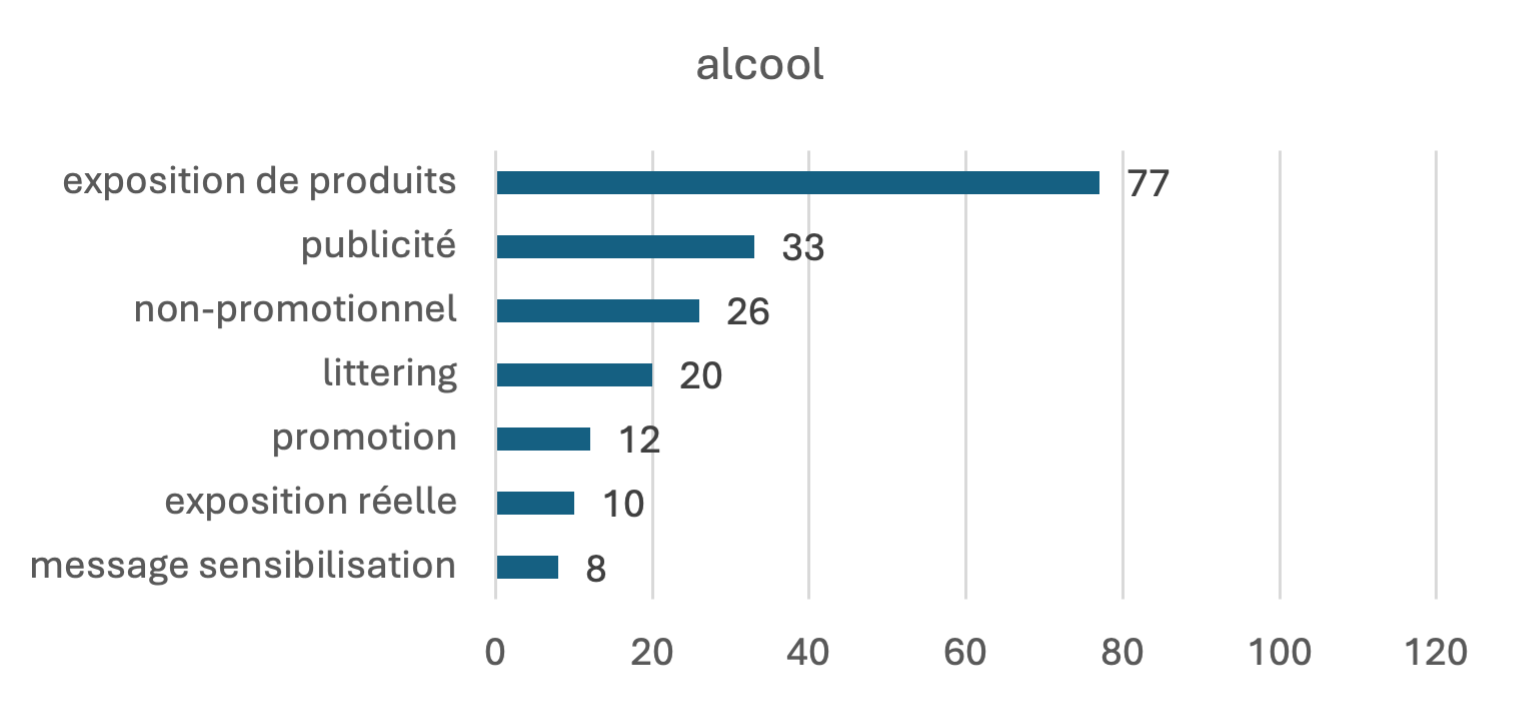 Pour l’alcool, la majorité des stimuli faisait référence à la bière, puis au vin et à plusieurs boissons alcooliques à la fois. Un quart des stimuli est associé à des promotions ou de la publicité (bière, mousseux et vin uniquement, en raison de la législation en vigueur), et plus d’un tiers à de l’exposition de produits. Ces stimuli ont surtout été relevés dans le contexte de la restauration (presque pour moitié) et les points de vente (un tiers), le reste se trouvant dans le domaine public, divers établissements ou dans les transports en commun/stations d’arrêt (généralement sous la forme de déchets sauvages).
