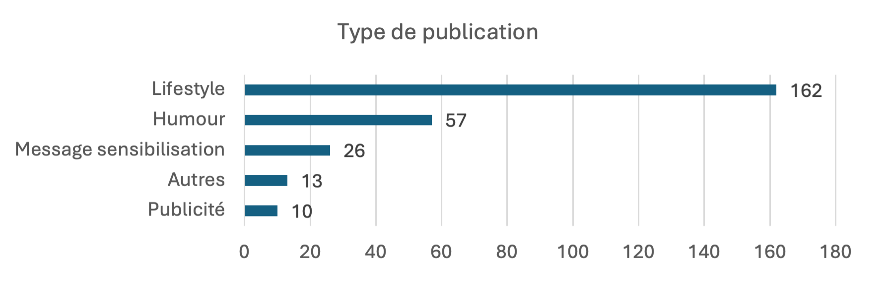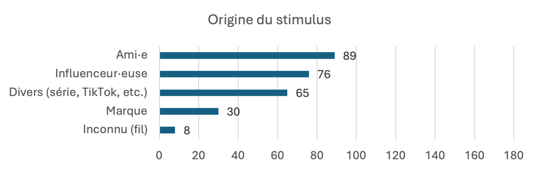 Le contenu des stimuli évoque très majoritairement des habitudes et activités quotidiennes impliquant la consommation de ces substances (« lifestyle ») ou revêt un caractère humoristique. La source est dans un tiers des cas un·e ami·e, et dans un quart des cas un·e influenceur·euse. Il s’agit en général d’images (environ deux tiers) et non de vidéos. Les stimuli sont pour la plupart favorables à l’usage de la substance (environ la moitié) ou neutres. Les 10% restants sont défavorables à la consommation (messages de sensibilisation).