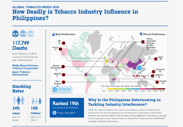 La Suisse est un pays qui n'a pas ratifié la Convention-cadre de l’OMS sur la lutte anti-tabac. Comme les quatre autre pays dans ce cas, elle défend une politique libérale et "soutient les entreprises du tabac en leur offrant des incitations, en soutenant une législation favorable à l'industrie (...)" dit le rapport.